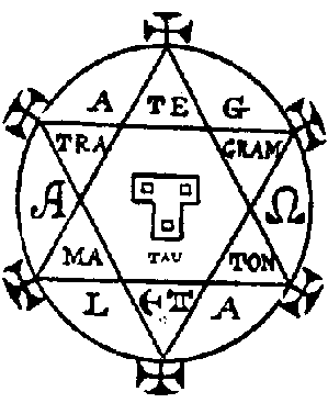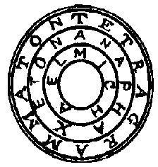 This is the Form of the Magic Ring, or rather Disc, of Solomon. It is to be held before the face of the exorcist to preserve him from the stinking sulphurous fumes and flaming breath of the Evil Spirits.