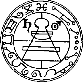 The Fortieth Spirit is Raum, Raim, or Raym. He is a Great Earl; and appeareth at first in the Form of a Crow, but after the Commmand of the Exorcist he putteth on Human Shape. His office is to steal Treasures out King's Houses and to carry it whither he is commanded, and to destroy Cities and Dignities of Men, and to tell all things, Past, and What Is, and what Will Be; and to cause Love between Friends and Foes. He was of the Order of Thrones. He governeth 30 Legions of Spirits, and his Seal is this, which wear thou as aforesaid.