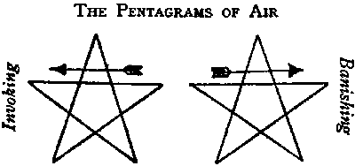 The Pentagrams are traced in the air with the sword or other weapon, the name spoken aloud, and the signs used, as illustrated.