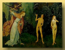 22. Y dijo Dios: "He aquí Adán hecho está cual uno de entre nosotros para conocer bello y malo.[27] Y ahora no sea que extienda su mano y coja del árbol de la vida, y viva por el siglo.[28]" 23. Y envióle Señor Dios fuera del paraíso de las delicias a trabajar la tierra; de que se le tomó. 24. Y echó fuera a Adán y le aposentó frente a frente del paraíso de las delicias; y ordenó a los querubines y la llameante espada la que se volvía,[29] a guardar el camino del leño de la vida.