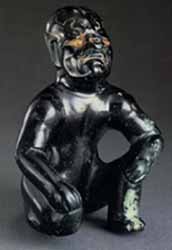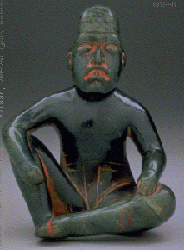 Olmec Ruler - or God - connected physical and spiritual worlds. His pose represents his means to link with the supernatural worlds. The turned down mouth, a feline feature, suggests that the human ruler was aided by a power anumal such as a cat, jacquar, traditionally the spirit campanion of shamans and kings.