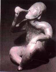 In the figurine the 'Standing figure of a Were-Jaquar' another Shaman is seen in the transformation process . This figure stands with one leg forward to counterbalance the slight torsion of the body. The arms are extended and each hand is balled into a fist - similar to a boxing stance. This Figure has almost the exact same features as the 'Crouching figure' that represent the ecstasy of the transformation. It¹s hands and feet are oversized to anticipate the paws of the Jaquar. In both figures the tortured facial features are intended to convey - not ferocity and aggressiveness - but emotional stress beyond endurance. It is precisely the sort of physically and mentally exhausting crisis - the crossing of the threshold between two worlds, to kinds of reality, if you will, that is part and practice of ecstatic Shamanism everywhere. The crossing over and transformation into the most powerful predator of the rain forest and the Savannah.
