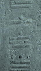 The low relief on this stone shows the detail from a four-digit numerical recording, read as 15.6.16.18. The vigesimal (or base-20) counting system has been used across Mesoamerica. A value of 5 is represented by a bar, and a value of 1 is represented by a dot, such that the three bars and single dot here stands for 16. The Maya would later adopt this counting system for their Long Count calendar. The date in this relief is the oldest recorded date in Mesoamerica, corresponding to a day in the year 31 B.C.