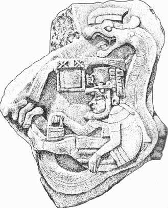 The shaman, wearing a large headdress, sits on the belly of a great rattlesnake. The serpent in this stela may be a predecessor to Quetzacoatyl - the Feathered Serpent - it is quite likely that this serpent may represent a god of wind or rain. The shaman holds a bag which may contain the hallucinogenic plants or mushrooms needed to break away his perception of the mundane realm and enter his spiritual plane.