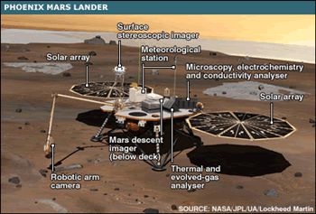 Unlike Nasa's roving robots Spirit and Opportunity, Phoenix will be stationary on Mars. It is due to carry out scientific operations for three months on the Martian surface.