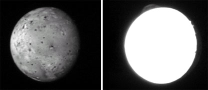 The pictures of Io provide the best glimpse yet of Tvashtar, one of the most active volcanoes on Io. The volcano can be seen in the "11 o'clock" position in the images. It is surrounded by a dark patch the size of Texas consisting of the fallout from the eruption.