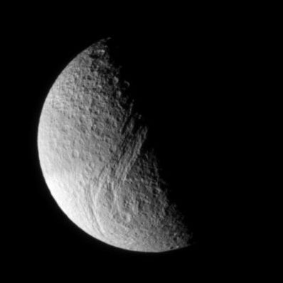 This view shows principally the Saturn-facing hemisphere of Tethys. The image was taken in visible light with the Cassini spacecraft narrow angle camera on Dec. 15, 2004, at a distance of approximately 560,000 kilometers (348,000 miles) from Tethys and at a Sun-Tethys-spacecraft, or phase, angle of 91 degrees. The image scale is about 3 kilometers (2 miles) per pixel.