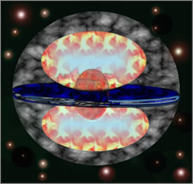 The stars in the binary system are much too small to be visible, but spectropolarimetry reveals that ejecta from an exploding white dwarf in SN 2002ic (dark red) is interacting with surrounding matter from a companion star, distributed primarily in the disk (dark blue); hydrodynamic shocks keep the supernova luminous nearly a year after its explosion. Outside the disk the density of the circumstellar matter is lower (gray). (Illustration: Wang) |