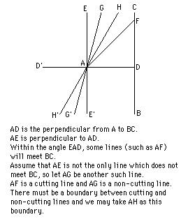 All straight lines which in a plane go out from a point can, with reference to a given straight line in the same plane, be divided into two classes - into cutting and non-cutting. The boundary lines of the one and the other class of those lines will be called parallel to the given line.