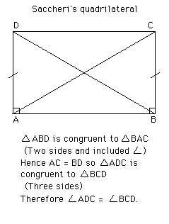 In this figure Saccheri proved that the summit angles at D and C were equal.The proof uses properties of congruent triangles which Euclid proved in Propositions 4 and 8 which are proved before the fifth postulate is used. Saccheri has shown:
