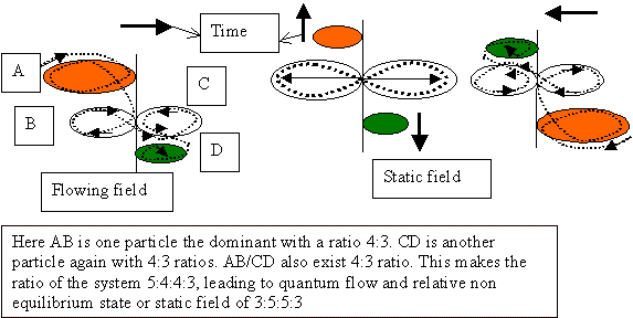 Now the two particles, one existing in the other, should have non-equilibrium of 4:3 between them so that flow occurs between them. This gives us 4-tier spiral path of flow with a ratio 5:4:4:3. The flow is now initiated and powered by two-quantum difference and is directed from the dominant to the recessive. As the flow proceeds a relative equilibrium state is reached [3:5:5:3]. Since by design an absolute equilibrium is forbidden by design, the system wishes to say in this relative equilibrium. This is the basal particle or system or the Universal Conscious Field in which every thing exist. The spirit or the intelligence is spread in a balanced manner in the system. The system now works to maintain this state. One must note that the two opposites designed in non-equilibrium manner with a direction of flow [time] is now divided into two and structured into a perfect balance or Justice there by arresting Time flow. This is the Structure of Quantum Consciousness and Intelligence. See figure below