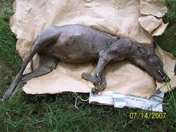 DeWitt County Extension Agent Anthony Netardus looked at the photographs of the carcass of the mysterious animal. “I’d rather defer to the experts, but it looks to me like it might be a coyote with a severe case of mange,” he said.